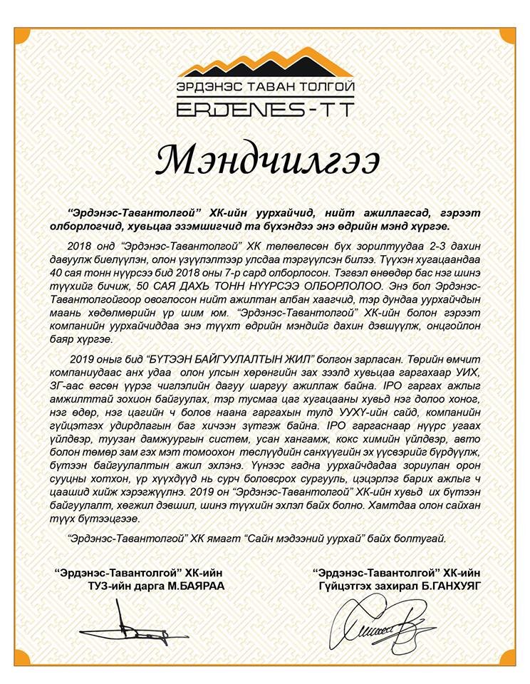 "Эрдэнэс-Тавантолгой" ХК 50 сая дахь тонн нүүрсээ олборлолоо